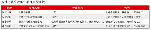 遼寧鐵嶺本是《紅樓夢(mèng)》續(xù)作作者高鶚的故里,但鐵嶺順手牽羊,公開(kāi)宣稱(chēng)是曹雪芹的“關(guān)外祖籍”,以全市之力打造“紅學(xué)文化之鄉(xiāng)”,2008年推出的“曹雪芹關(guān)外祖籍紀(jì)念地”項(xiàng)目是鐵嶺休閑度假區(qū)的10大項(xiàng)目之一,這10大項(xiàng)目總投資約3.8億元,建設(shè)周期為2年,年均經(jīng)營(yíng)收入4.3億元,投資利潤(rùn)率 33%,投資回收期為3年。