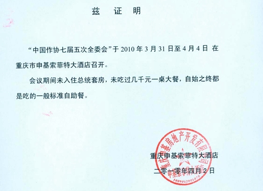 中國作協(xié)鄭重聲明:在重慶召開的中國作協(xié)七屆九次主席團會和七屆五次全委會,沒有任何與會人員入住總統(tǒng)套房;沒有安排所謂2000多元一桌的宴席,全體與會人員用的是酒店平日標準的自助餐。會議期間,組織與會人員參觀渣滓洞集中營舊址、“打黑除惡”資料展覽和到重慶烈士陵園祭奠掃墓等活動,都是集體乘坐大巴、中巴車往返。