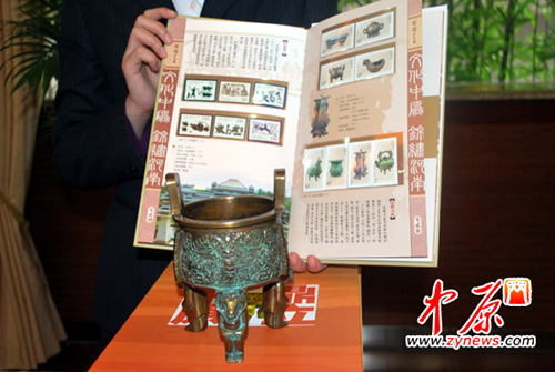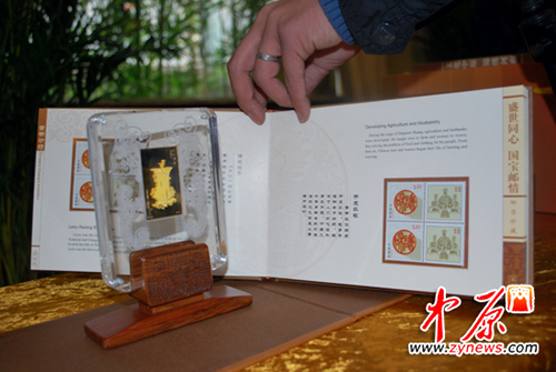 本次活動還現(xiàn)場展示了由中國郵政集團公司批準(zhǔn)發(fā)行的《河之南》郵票珍藏冊,《國寶郵情》雙連壺。內(nèi)容涵蓋建國珍郵、中原“國寶”、貴金屬等多個方面。該系列郵票濃縮了中原文化的博大精深,彰顯中原文化在中國文明史上的核心地位。這也是鄭州市郵政局連續(xù)五年為拜祖大典奉獻的文化盛宴。