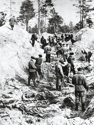 1943年4月13日,柏林電臺(tái)向全世界報(bào)告的一則消息,說在蘇聯(lián)斯摩棱斯克附近的卡廷森林發(fā)現(xiàn)了一批埋有成千上萬波蘭軍官尸體的巨大墳?zāi),他們都是被人有步驟并且熟練地處決的。