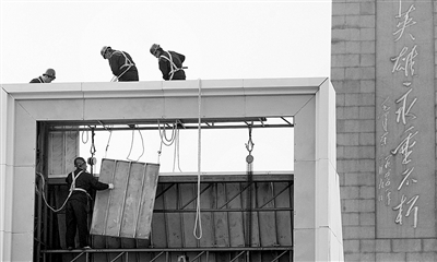 上午8時許,記者在人民英雄紀(jì)念碑前看到,工人正在組裝放置孫中山先生畫像的背板相框,并且將相框整體加固。