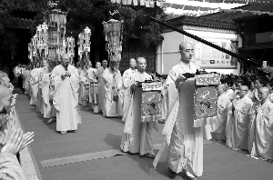 7:50,迎請法會(huì)結(jié)束,棲霞寺住持隆相法師跪拜之后,小心翼翼地捧起了錦盒,向朝天宮的東門走去,傳義和曙光兩名法師隨行兩側(cè)護(hù)衛(wèi)。