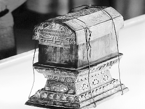 記者看到,整個啟請過程中稍微有點難度的就是須彌座的長方形金棺銀槨。這套金棺銀槨長和高約為15厘米,寬約六七厘米,槨蓋上有細密的花紋,前頭還垂下了兩重屋檐。槨身四周有持金剛杵的天王或力士站在門前,代表天龍八部,即佛祖的護衛(wèi);還有吹笛和排簫的天女天象,衣帶飄飄仿佛凌空飛行。須彌座是由佛座演變來的,這個銀槨的造型明顯寓意佛祖居住的宮殿。銀槨內(nèi)是一個小一號的金棺,用金絲捆扎,防止棺蓋滑脫,F(xiàn)場,專家們用手輕輕“推”著捆綁的金絲,沒用幾分鐘,就解開了千年謎底,露出了里面的佛頂真骨。