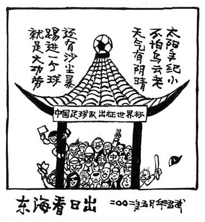 記者在采訪中同時了解到,華君武還是一位足球迷,2002年世界杯,中國隊(duì)出征韓國之前,他專門畫了一幅名叫《東海看日出》的漫畫。