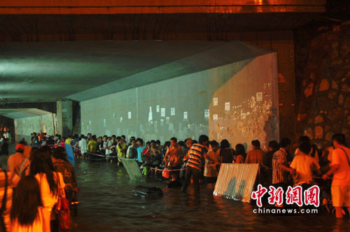 13日晚9時左右,記者來到武漢市江漢區(qū)新華下路沿線,人行道上漬水已達30厘米左右。其中,5米高的鐵路橋涵洞被淹去近半,最深積水處超過2米,整條道路交通基本癱瘓。許多市民在經過此路段時,不得不卷起褲腳、提著鞋子涉水通過。