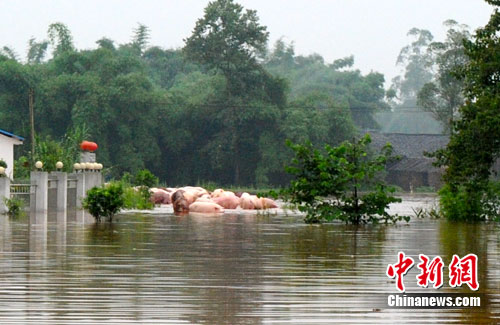 18日早上,中新網(wǎng)記者在受災(zāi)嚴(yán)重的重慶潼南柏梓鎮(zhèn)看到,雖然雨已經(jīng)停歇,但鎮(zhèn)上的洪水仍未褪去,多條街道的積水仍有半人深。洪水完全包圍了當(dāng)?shù)氐囊粋(gè)養(yǎng)豬場,近百頭被淹的活豬成片浮在水面上,據(jù)該場工作人員介紹,該豬場養(yǎng)的6000多頭豬均被洪水淹沒,僅17日便死了1000多頭豬。因豬場受困之處水位較深無法救援,豬場場主只能眼睜睜看著豬被洪水沖擊漂浮。