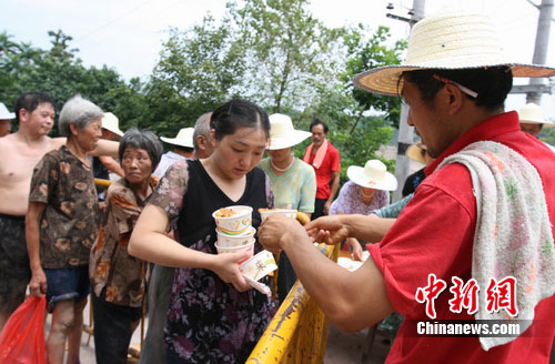 在肖溪鎮(zhèn)民國新街,盒飯供應(yīng)處也喂?jié)M了人,菜飯飄香!拔覀冞@個安置點(diǎn)的災(zāi)民共有200多人,全部住在老百姓家里,吃飯由政府統(tǒng)一解決。還設(shè)立了開水集中供應(yīng)點(diǎn),方便群眾解渴!