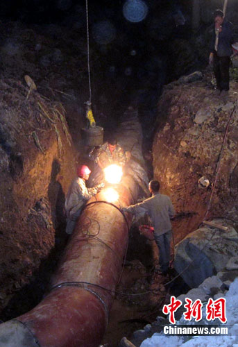 2日18時許,記者來到施工現(xiàn)場,此時燈火通明,上百名工人正在緊張地作業(yè)。據一名工人介紹,他們現(xiàn)在分成兩組進行搶修,每班工作都在12小時左右,基本上吃住都是在施工現(xiàn)場。