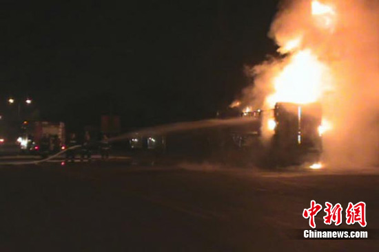 消防隊(duì)員針對(duì)現(xiàn)場(chǎng)情況,分別在車的四側(cè)鋪設(shè)水帶架設(shè)水槍陣地用對(duì)火進(jìn)行撲救,20分鐘后,大火被撲滅。