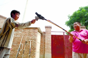 吸刀器、鎖喉器、捕捉器、自救器,昨日,北京八中的萬(wàn)能工(什么活都能干的工人)齊海軍在通州古城村的自家門(mén)前,演示起他發(fā)明的校園安保“四件套”。