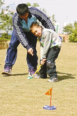 “我揮了半天,終于進(jìn)洞了。”10名二年級的小學(xué)生正在體育教師李科的帶領(lǐng)下進(jìn)行高爾夫球訓(xùn)練。這些孩子拿的高爾夫球桿是一根大約長30厘米的塑料桿,另外還有15個(gè)紅、藍(lán)色球洞分置在草坪四周。