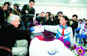 昨天下午3時(shí),1973年諾貝爾物理學(xué)獎(jiǎng)得主伊瓦爾·賈埃弗教授來到北京三帆中學(xué),迎接他的是鮮艷的紅領(lǐng)巾和熱烈的掌聲,已近八旬的賈埃弗教授精神矍鑠,他笑著說,自己來到中國受到了超級(jí)明星般的接待,對(duì)中國來講,諾貝爾獎(jiǎng)格外重要,“但事實(shí)上我知道得很少!
