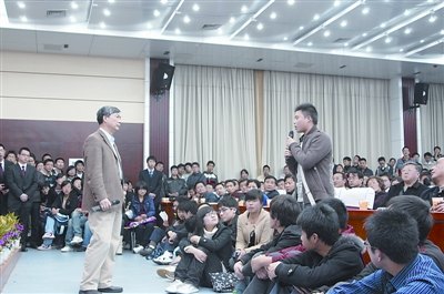 面對(duì)學(xué)生提問(wèn),李培根表示,學(xué)校處于高速發(fā)展期,引進(jìn)的許多重大科研項(xiàng)目都需要錢;人文氛圍的營(yíng)造不容小視,但硬件暫時(shí)落后,“要克服一下”。“咱們學(xué)校的行政樓,在中國(guó)很難找到比它更差的。”他輕輕說(shuō),同學(xué)們報(bào)以掌聲。2個(gè)多小時(shí)的見(jiàn)面會(huì),李培根站著回答問(wèn)題。 (記者 李佳)