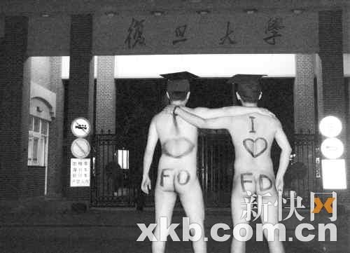 昨日,一條名為《復旦學生裸奔慶祝畢業(yè)》的圖文帖,火遍貓撲、天涯、華聲、網(wǎng)易等論壇。在貼出的圖片中,兩名男生頭戴學士帽,裸體在復旦校園內(nèi)奔走,并在學校大門、校訓等多個地方留影。在網(wǎng)帖中,發(fā)帖者并未對兩名男生作介紹,但從其中一名男生在復旦的“恒隆物理樓”留影來看,網(wǎng)友們認為這兩名男生應該是復旦物理系的畢業(yè)生。
