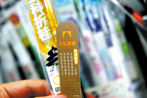 “這款狀元筆買的人很多,大家都希望能高中狀元,上次一個家長就買了10支”。昨天下午,省城長江路上一家文具店內店家向顧客介紹。記者抽取了一款外包裝印有“登科折桂”字樣的中性筆筆芯,打開后里面竟然還附帶一張小卡片,卡片上寫有“上上簽”、“天壇祈!钡却蠹罄恼Z句(如圖)。店家王女士告訴記者,這種“討彩”文具是今年才大量出現的,賣得非常好,有的學生和家長還專門前來購買!捌鋵嵈蠹乙捕际欠N心理暗示,圖個吉利,商家正好抓住了消費者的心理”王女士說。