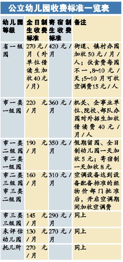 據(jù)介紹,公立幼兒園是屬于全市收費(fèi)最規(guī)范的層次,因?yàn)榘次飪r局規(guī)定,省一級、市一類園、市二類園、市三類園和未評估的幼兒園、托兒所,都有明確的收費(fèi)標(biāo)準(zhǔn)。公立園的每項(xiàng)收費(fèi)、標(biāo)準(zhǔn)及收費(fèi)許可證都須公示在公布欄。不過,這一層次也是目前全市幼兒園中最少的。