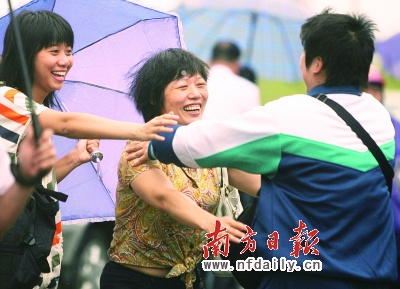 佛山三中高三的鐘老師沒想到自己會成為學生們的“催淚彈”,一名女生從考場出來就撲上去與鐘老師擁抱,一邊大聲地說:“老師我從來沒有覺得你像今天這么漂亮過!你讓我不要想你,但考試出來你總是第一個出現(xiàn)在我面前!”鐘老師被七八名女生團團圍住。起初大家還有說有笑,很快就有一名短發(fā)女生轉笑為泣,伏在鐘老師肩頭淚流滿面。其余女生見狀也紛紛紅了眼圈,捂住嘴不想哭出聲來。記者注意到,這些女生每人衣服上也都別著一只笑臉徽章!斑@都是老師送給我們的,希望我們能夠笑對高考!