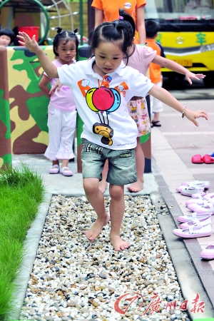 本報(bào)訊 (記者陳昕宇)赤足踩碎石、晨練時(shí)需要過“梅花樁”、俯身貼地穿越水管、輕舒猿臂通過懸掛在半空中的吊臂、寒冬冷水浴……上述情景不是出現(xiàn)在特種部隊(duì)的訓(xùn)練營中,而是佛山一所位于高檔住宅小區(qū)的幼兒園專為幼兒所開設(shè)的生存磨難教育課程。 據(jù)介紹,生存磨難課程最早起源于日本教育界,目的為磨煉學(xué)生的意志。昨日,記者來到該所幼兒園,對(duì)生存磨難教育的部分項(xiàng)目進(jìn)行了體驗(yàn)。