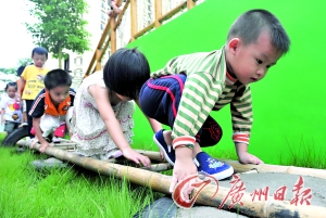 記者在現(xiàn)場(chǎng)見到,與其他幼兒園不同的是,剛開辦的禪城區(qū)天湖酈都幼兒園1700平方米的戶外活動(dòng)場(chǎng)地上,布滿了“梅花樁”、“吊臂橫桿”、“高空爬網(wǎng)”、“水泥管”、“迷宮”、“碎石路”等各種各樣的設(shè)施,儼然一個(gè)小型“戶外軍事拓展基地”。