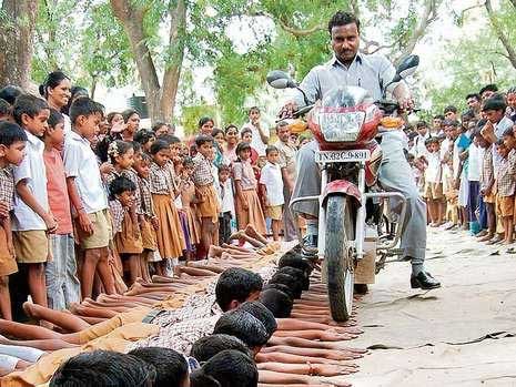 據(jù)德國(guó)《圖片報(bào)》7月29日消息,如圖所示,一群印度孩子平躺在地上,將自己的手臂向前伸。一名男子騎著摩托車(chē)從他們的手上軋過(guò)去……