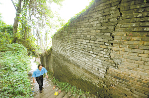 昨日下午5時左右,記者在現場看到,土堆有10多米高。在土堆最頂部,有一條貫通的裂縫,裂縫最寬處有8厘米左右。因受前晚昨晨的大雨沖刷,已無法確認其是否是新發(fā)生的裂痕。土堆底部緊靠一堵圍墻,圍墻外是一條石板路,土堆最高處已堆至圍墻腰部。一部分圍墻已經不存在——今年3月中旬的一場大雨后,土堆沉降,將這部分圍墻推倒。仍存的部分墻體,也已有松動跡象,并有裂縫朝石板路一側發(fā)生傾斜。