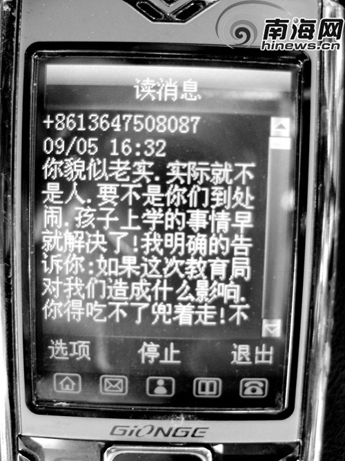 王才子給記者看了王校長辱罵他的短信。記者看了其中一條短信內(nèi)容:“你貌似老實,實際就不是人,要不是你們到處鬧,孩子上學(xué)的事情早就解決了!我明確告訴你,如果這次教育局對我們造成什么影響,讓你吃不了兜著走!”另一條短信內(nèi)容是:“象你這種貪得無厭的人,不但不想讓你孩子上好學(xué)校,還想拿孩子來賺錢,等我忙完了這整(原文如此——記者注)子,會找人跟你算清楚的!”