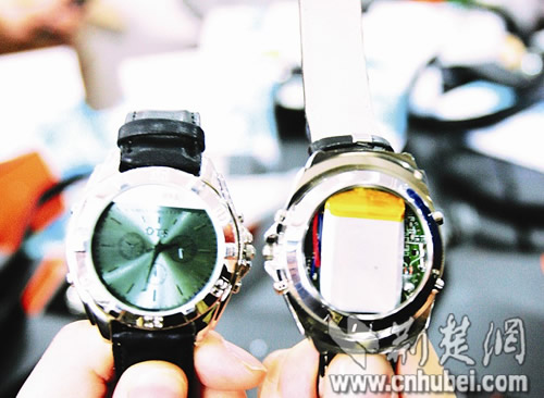 “竅門在這里。”工商人員把手表后蓋揭開,里面多了一塊微型電路板和芯片。原來,這是一套短信接收裝置,收到短信后,還可以存儲(chǔ)在手表中。