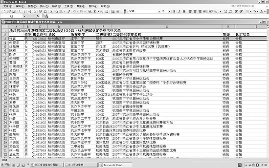 打開這個公示名單,前兩行的內(nèi)容分別是:“許鑫;性別:男;報名序號:13103003;地區(qū):杭州市淳安;所在中學(xué):淳安中學(xué);二級證書:射擊;二級證書競賽名稱:2007年浙江省中小學(xué)生射擊錦標(biāo)賽;等級:省級;認定結(jié)果:合格”。