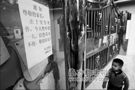 在公開信的邊上還貼著一份機關(guān)四幼的通知,稱“由于突發(fā)事件,今天暫停課一天”。在這份通知的左下角,有人用圓珠筆歪歪扭扭地寫下了不滿:“家長要求退還所有費用,到其他學校上學!
