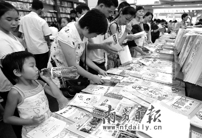 在廣州購(gòu)書中心二樓,家在白云區(qū)的曾先生手里拿著一張清單,上面是準(zhǔn)備升讀五年級(jí)的女兒手抄的各科必備輔導(dǎo)書,“老師指定的,全班必須要買同一種!痹壬f。但是,他在購(gòu)書中心轉(zhuǎn)了大半天,還是沒有找到指定的那本語(yǔ)文輔導(dǎo)書,顯得很無奈。據(jù)了解,每年開學(xué),曾先生都肩負(fù)著為女兒找書的重任,為求一本“指定教輔”,奔走于各大書店。曾先生告訴記者,曾經(jīng)為了購(gòu)買女兒的一本練習(xí)冊(cè),全家人都出動(dòng)了,從白云區(qū)一直跑到位于黃埔區(qū)的購(gòu)書中心分店才找到。