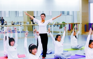 “屈右膝,左腿伸直,雙臂打開……”昨天上午,伴隨著輕柔的音樂,北京二中舞蹈廳里30名高中女生正在上瑜伽課。30來名高一學生手揮高爾夫球桿,有模有樣地學習擊球、推球。
