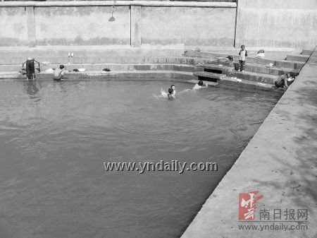 滇南武校內(nèi)有一個(gè)游泳池,但多年未用,泳池成了學(xué)生晾曬衣服的場(chǎng)地。游泳池的南側(cè)還有一池子,池內(nèi)的水就是從校外公路邊引來(lái)的龍?zhí)端。池子的北面是走道,地面高出水面約150厘米。池子的東、南、西3面都有臺(tái)階下到池底,學(xué)生們可以在這里洗衣服,當(dāng)然,練武的學(xué)生們也會(huì)在課后站到不深的池內(nèi)擦擦身子。