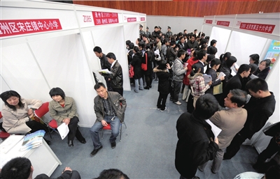 昨天,近幾年來本市首場中小學教師專場招聘會在首師大體育館舉行,1.3萬名北京高校應屆畢業(yè)生蜂擁而至,競爭132家本市中小學提供的1100余個崗位。在招聘現(xiàn)場,市區(qū)學校攤位前人頭攢動,而郊區(qū)學校則門可羅雀,兩極分化嚴重。