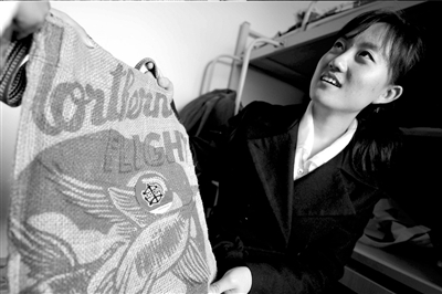 石嫣展示她從美國帶回的手工制環(huán)保袋。 記者 范繼文攝