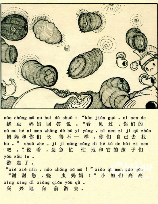 最近,關(guān)于《小蝌蚪找媽媽》原著的改編又有了新動(dòng)作———有網(wǎng)友把《小蝌蚪找媽媽》的主角小蝌蚪改成了小蛆蟲,故事里原來的配角鯉魚、烏龜、白鵝則變成了蟯蟲、線蟲和屎殼郎。有一位80后的小青年還給改編的文字配上自己創(chuàng)作的情景漫畫圖,再加進(jìn)文字與拼音標(biāo)注,《小蝌蚪找媽媽》就這樣變成了《小蛆蟲找媽媽》。