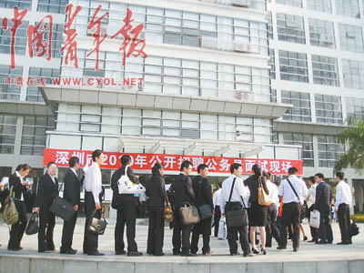 23歲的鐘文去年從深圳大學(xué)法學(xué)專業(yè)畢業(yè),她報(bào)考的是深圳市坪山新區(qū)執(zhí)法員的職位。和鐘文一樣來參加面試的考生有1036人,是從34545名考生中通過筆試篩選出來的“幸運(yùn)兒”。今天,他們將經(jīng)歷又一次殘酷競(jìng)爭(zhēng)——只有346人能最終進(jìn)入深圳的聘任制公務(wù)員隊(duì)伍。