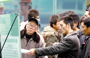 農(nóng)民工專場招聘會(huì),吸引了不少應(yīng)屆大學(xué)畢業(yè)生前來應(yīng)聘。他們對(duì)第一份工作的月薪期望,在1000元左右,與不少有一技之長的農(nóng)民工相比,少了一半。