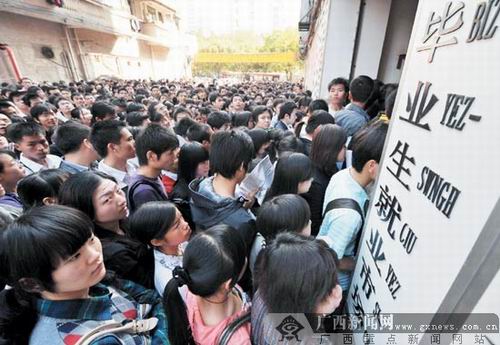 2月11日,廣西師范學院畢業(yè)生小陳特地起了個大早,趕在8時30分來到南寧市人才市場,參加當天舉行的春季高校畢業(yè)生專場招聘會。令小陳吃驚的是,人才市場入口處已有兩三百名畢業(yè)生在等候,原打算提前占據(jù)“有利地形”的他,只能排在離入口約20米遠的空地。