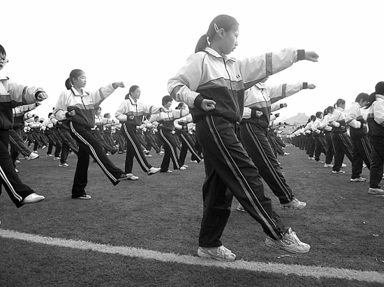 為豐富學(xué)生課間活動(dòng)的形式,該校根據(jù)中學(xué)生身心發(fā)展的特點(diǎn),研制出了一套“另類”的課間操——“少年拳”。據(jù)了解,這套“少年拳”主要是借鑒了中國傳統(tǒng)武術(shù)的基本招式,在此基礎(chǔ)上進(jìn)行簡化和藝術(shù)處理,最終形成了一整套連貫的武術(shù)動(dòng)作,能使人的身體得到全方位的鍛煉。