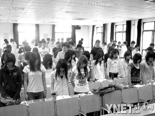 教室里、大禮堂、宿舍樓、辦公室、實(shí)驗(yàn)室……昨天下午14點(diǎn)28分,北京各高校凡是有學(xué)生和老師的場(chǎng)所,都成為師生為四川災(zāi)區(qū)死難同胞默哀的地方。清華大學(xué)昨天開(kāi)通了所有教室的廣播,廣播連通了中央人民廣播電臺(tái)。隨著那一聲尖銳而悠長(zhǎng)的鳴響劃破天空,清華第一教學(xué)樓101教室正在上課的100多名同學(xué)站起來(lái),共同為災(zāi)區(qū)死難者默哀,主講老師黃成英教授打開(kāi)了他特意準(zhǔn)備的PPT頁(yè)面。