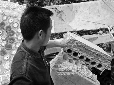 熊永豪認為,除了設計上的先天不足,教學樓在后期施工中,也存在不少隱患。站在廢墟上,他隨手撿起一塊磚頭,上面光滑平整,幾乎沒有粘著水泥!斑@表明兩個問題,可能是水泥的標號不夠,或者是涂在磚上沙灰飽和度不夠。”熊永豪說。