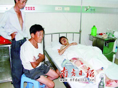 在電白縣人民醫(yī)院6樓,記者看到四肢全部被撞成粉碎性骨折的鄧學(xué)廣。鄧學(xué)廣是陳村中學(xué)初一(7)班的學(xué)生。他回憶說,早上6時(shí)30分左右他從家中騎自行車回校上課,等他發(fā)現(xiàn)有小汽車時(shí),他已經(jīng)被撞上了。鄧學(xué)廣的親人說,7名學(xué)生全部是男生,都是那行村人。