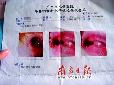 8月18日,何女士帶著耳痛未減的小賢復(fù)診,經(jīng)過電子鏡檢查,診斷為左耳鼓膜外傷性穿孔!袄锩嬉呀(jīng)破了一個(gè)口,孔里和四周充滿紅色的血漿。醫(yī)生說聽力降低了20-30分貝。”何女士指著化驗(yàn)單,一臉憂心忡忡。