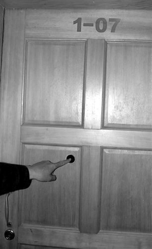 學(xué)生們還在上課,女生公寓空無(wú)一人,只有生活老師在里面守候,“鐵將軍”把住女生公寓的大門,生活老師打開大門后,記者進(jìn)入了女生公寓。女生公寓有7層樓高,過道兩旁對(duì)應(yīng)著一間間女生寢室。每間寢室的房門上,果然就有一個(gè)圓形小孔。這小孔直徑只有四五厘米,記者將眼睛貼近小孔朝里面一望,寢室里一覽無(wú)余。