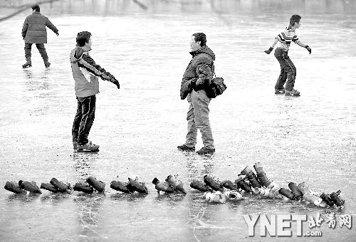 下午3時,北大未名湖冰面上有百余人在滑冰和玩耍。未名湖冰層的厚度不均,湖西部分甚至并未完全冰封。未名湖東南角有一塊醒目的提示牌,上面寫著“冰面薄危險,請勿上冰”。對外租冰鞋的幾名商販在湖南岸,據(jù)其中一位攤主介紹,他們是從上周六起在未名湖邊租冰鞋的,以后出攤的時間不固定,要看氣溫是否適合滑冰。