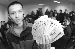記者在現(xiàn)場注意到,部分學(xué)生代表拿到同學(xué)們預(yù)訂的火車票后仍愁眉不展。環(huán)境學(xué)院07級碩士研究生石昕就拿著一疊票在登記表上核對、打鉤,不時嘆息。他們班26人訂票,只拿到了14張票,其余都沒有。“不是沒票,是有票他們不要!笔空f,沒訂到票的同學(xué)多半是往重慶、哈爾濱等方向的,都是要求太高,指定要硬臥,坐票都不考慮。這讓火車站工作人員為了難,這些地區(qū)火車票本身就很緊,臥鋪票更加有限,非臥鋪不要的要求根本無法滿足。