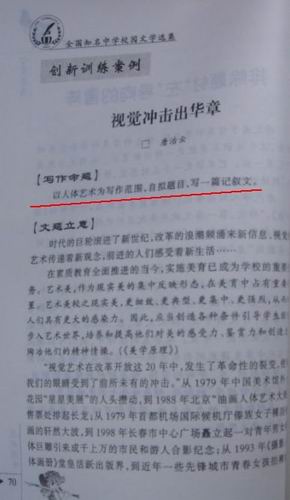 該書(shū)主編“唐治云”在引言部分提到,這是學(xué)校的一項(xiàng)“創(chuàng)新訓(xùn)練案例”,寫(xiě)作命題是“以人體藝術(shù)為寫(xiě)作范圍,自擬題目,寫(xiě)一篇記敘文”,以“視覺(jué)沖擊出華章”。