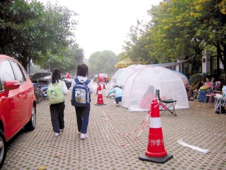 昨晚,記者來(lái)到祈福新村學(xué)校門口,昏黃的燈光下,疲憊不堪的家長(zhǎng)們坐在躺椅上閑聊,有的干脆鉆到自帶的蒙古包帳篷里睡覺(jué),F(xiàn)場(chǎng)到處彌漫蚊香和驅(qū)蚊水味道。