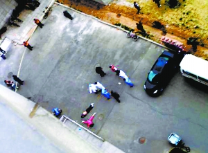 這兩名目擊者說,昨晚6時20分,一名女生從該樓13層東南側的樓梯窗口墜下,約5分鐘后男生從同樣的位置墜下。墜樓后,兩名學生橫躺在宿舍樓南側的地面上,女生穿粉紅色睡衣,男生光著上身,下身穿牛仔褲,身下有大片血跡。記者在47號公寓樓的 13層樓梯間看到,兩人墜樓的窗臺高約一米,窗戶的面積不足一平方米,窗戶的紗窗已被撕開,一件藍色的運動上衣還留在窗臺上,附近地面上還有數(shù)根煙頭。而該樓一層東側入口處的欄桿也被砸斷。