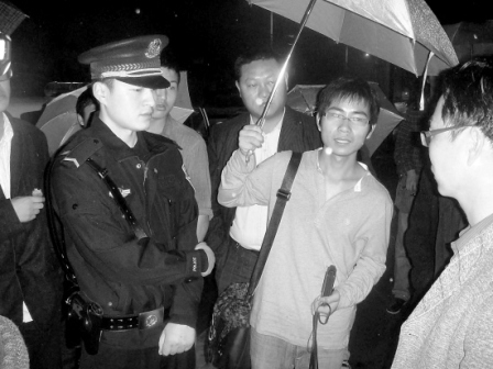 “下午2點20分左右,距比賽開始僅僅剩下40分鐘了,賽場內(nèi)前奏的音樂已經(jīng)響起,這時‘米黃外套’回來終于告訴大家,由于此次用的是賽車場發(fā)給上海市中學生的團體票,大學生不能入場,所以今天可能‘沒戲了’。此時九陽旅行社的洪經(jīng)理看起來也焦頭爛額,他沒有打傘,站在大雨里,水珠不斷順著頭發(fā)流下!